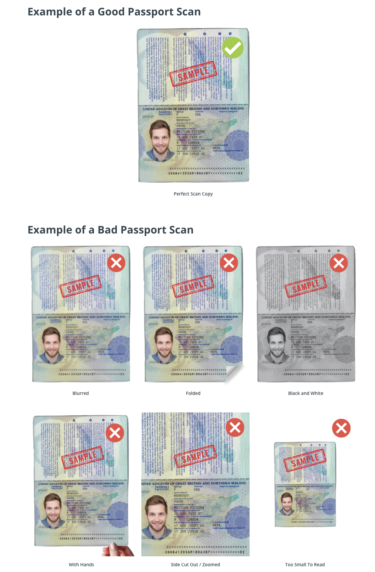 ❌ Part of the passport page cut off (make sure the whole page is visible).